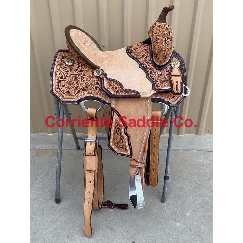 Engraved Barrel StirrupsUpgradedConchos+$100SeatCan Be Changed To A Solid Color Suede Seat Of Your ChoiceFURTHER DETAILSThis saddle is built on a wooden rawhide covered tree and comes with a latigo, back flank, stirrups, back billets and offstrap. To order give us a call or email us and we will get started on one for you. We take Visa, Mastercard and Discover. We offer seat sizes 12″ inch, 12.5″ inch, 13″ inch, 13.5″ inch, 14″ inch, 14.5 inch, 15″ inch, 15.5″ inch, and 16″ inch in this saddle. On any saddle, we can add your brand, custom lettering, upgraded conchos, upgraded stirrups, etc. Trophy lettering is available for $50 as well on any saddle.Seat can be changed to a solid color suede seat of your choice.