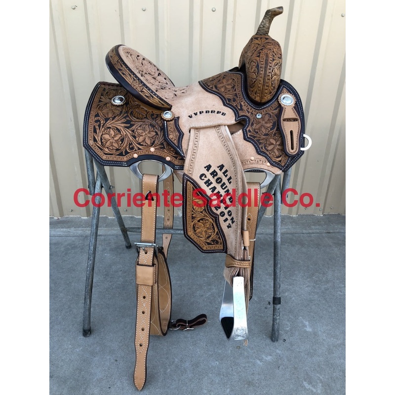 In-Skirt Fancy Dee Ring inBack45 Degree SkirtingRawhide HornLeather Cheyenne Roll Tooled Hard Seat with PaintEngraved Barrel Stirrups+$10Trophy Lettering+$50**Saddle Can Be Made Without Lettering**SeatCan Be Changed To A Solid Color Suede Seat Of Your ChoiceFURTHER DETAILSThis saddle is built on a wooden rawhide covered tree and comes with a latigo, back flank, stirrups, back billets and offstrap. To order give us a call or email us and we will get started on one for you. We take Visa, Mastercard and Discover. We offer seat sizes 12″ inch, 12.5″ inch, 13″ inch, 13.5″ inch, 14″ inch, 14.5 inch, 15″ inch, 15.5″ inch, and 16″ inch in this saddle. On any saddle, we can add your brand, custom lettering, upgraded conchos, upgraded stirrups, etc. Trophy lettering is available for $50 as well on any saddle.Seat can be changed to a solid color suede seat of your choice.