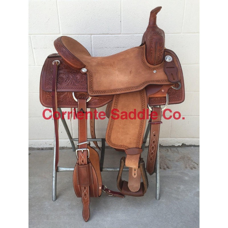 Square SkirtsRawhide Stirrups Seat can be changed to a solid color suede seat of your choice.FURTHER DETAILSThis saddle is built on a wooden rawhide covered tree and comes with a latigo, back flank, stirrups, back billets and offstrap. To order give us a call or email us and we will get started on one for you. We take Visa, Mastercard and Discover. We offer seat sizes 14″ inch, 14.5″ inch, 15″ inch, 15.5″ inch, 16″ inch, 16.5 inch, 17″ inch, and 18″ inch in this saddle. On any saddle, we can add your brand, custom lettering, upgraded conchos, upgraded stirrups, etc. Trophy lettering is available for $50 as well on any saddle. Seat can be changed to a solid color suede seat of your choice.