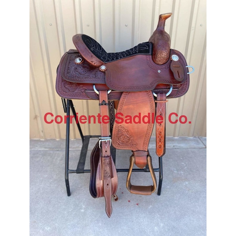 This saddle is built on a wooden rawhide covered tree and comes with a latigo, back flank, stirrups, back billets and offstrap. To order give us a call or email us and we will get started on one for you. We take Visa, Mastercard and Discover. We offer seat sizes 14″ inch, 14.5″ inch, 15″ inch, 15.5″ inch, 16″ inch, 16.5 inch, 17″ inch, and 18″ inch in this saddle. On any saddle, we can add your brand, custom lettering, upgraded conchos, upgraded stirrups, etc. Trophy lettering is available for $50 as well on any saddle. Seat can be changed to a solid color suede seat of your choice.