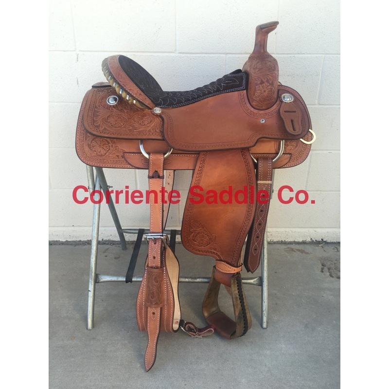 Rawhide StirrupsSeat Can Be Changed To A Solid Color Suede Seat Of Your ChoiceFURTHER DETAILSThis saddle is built on a wooden rawhide covered tree and comes with a latigo, back flank, stirrups, back billets and offstrap. To order give us a call or email us and we will get started on one for you. We take Visa, Mastercard and Discover. We offer seat sizes 14″ inch, 14.5″ inch, 15″ inch, 15.5″ inch, 16″ inch, 16.5 inch, 17″ inch, and 18″ inch in this saddle. On any saddle, we can add your brand, custom lettering, upgraded conchos, upgraded stirrups, etc. Trophy lettering is available for $50 as well on any saddle. Seat can be changed to a solid color suede seat of your choice.