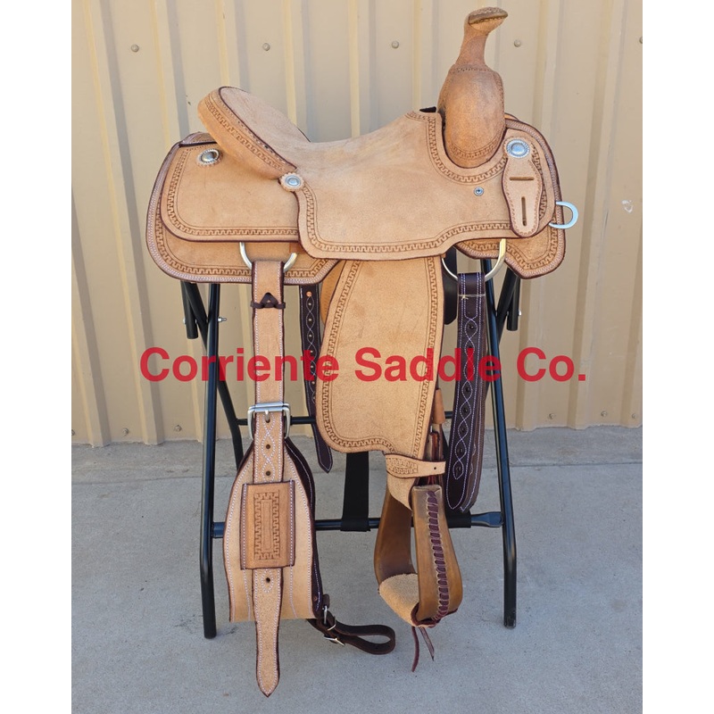 This saddle is built on a wooden rawhide covered tree and comes with a latigo, back flank, stirrups, back billits and offstrap. To order give us a call or email us and we will get started on one for you. We take Visa, Mastercard and Discover. We offer seat sizes 14″ inch, 14.5″ inch, 15″ inch, 15.5″ inch, 16″ inch, 16.5 inch, 17″ inch, and 18″ inch in this saddle. On any saddle, we can add your brand, custom lettering, upgraded conchos, upgraded stirrups, etc. Trophy lettering is available for $50 as well on any saddle. Seat can be changed to a solid color suede seat of your choice.
