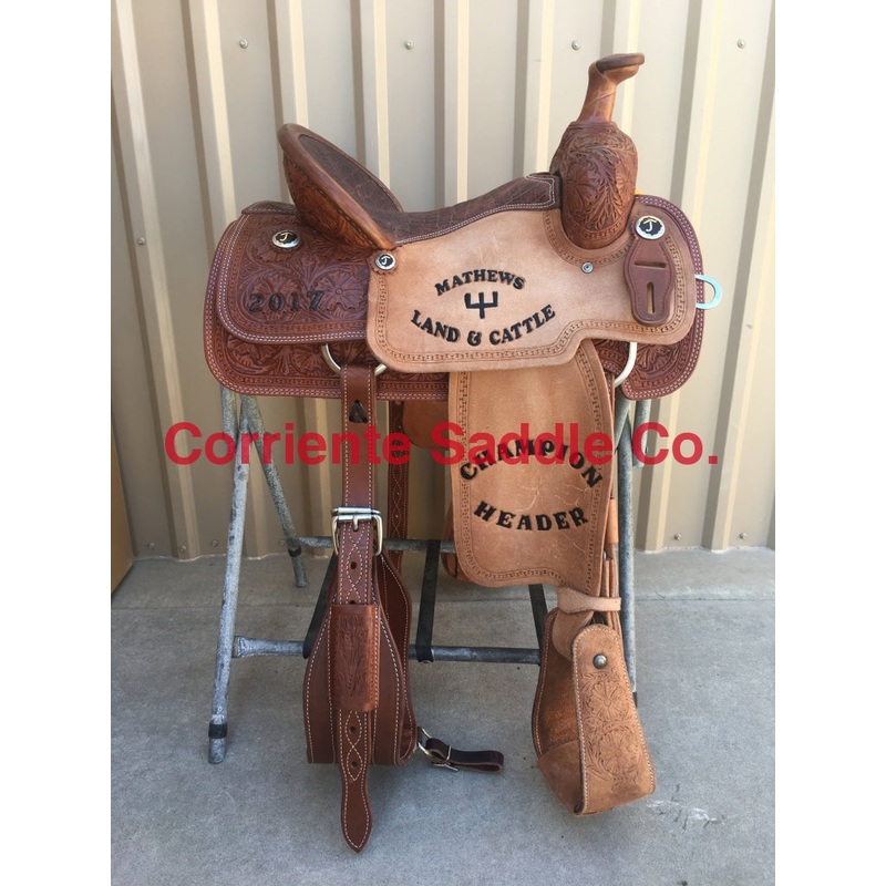 This saddle is built on a wooden rawhide covered tree and comes with a latigo, back flank, stirrups, back billits and offstrap. To order give us a call or email us and we will get started on one for you. We take Visa, Mastercard and Discover. We offer seat sizes 14″ inch, 14.5″ inch, 15″ inch, 15.5″ inch, 16″ inch, 16.5 inch, 17″ inch, and 18″ inch in this saddle. On any saddle, we can add your brand, custom lettering, upgraded conchos, upgraded stirrups, etc. Trophy lettering is available for $50 as well on any saddle. Seat can be changed to a solid color suede seat of your choice.