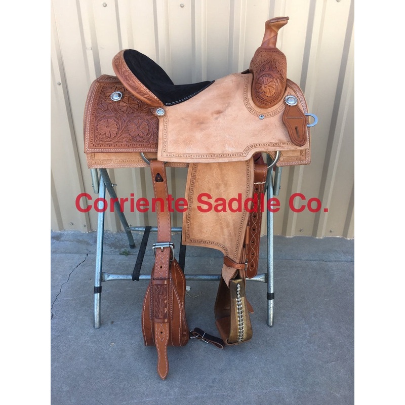 This saddle is built on a wooden rawhide covered tree and comes with a latigo, back flank, stirrups, back billits and offstrap. To order give us a call or email us and we will get started on one for you. We take Visa, Mastercard and Discover. We offer seat sizes 14″ inch, 14.5″ inch, 15″ inch, 15.5″ inch, 16″ inch, 16.5 inch, 17″ inch, and 18″ inch in this saddle. On any saddle, we can add your brand, custom lettering, upgraded conchos, upgraded stirrups, etc. Trophy lettering is available for $50 as well on any saddle. Seat can be changed to a solid color suede seat of your choice.