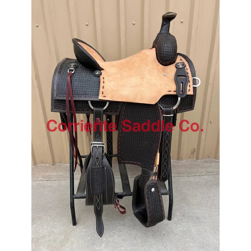 This saddle is built on a wooden rawhide covered tree and comes with a latigo, back flank, stirrups, back billets and offstrap. To order give us a call or email us and we will get started on one for you. We take Visa, Mastercard and Discover. We offer seat sizes 14″ inch, 14.5″ inch, 15″ inch, 15.5″ inch, 16″ inch, 16.5 inch, 17″ inch, and 18″ inch in this saddle. On any saddle, we can add your brand, custom lettering, upgraded conchos, upgraded stirrups, etc. Trophy lettering is available for $50 as well on any saddle. Seat can be changed to a solid color suede seat of your choice.