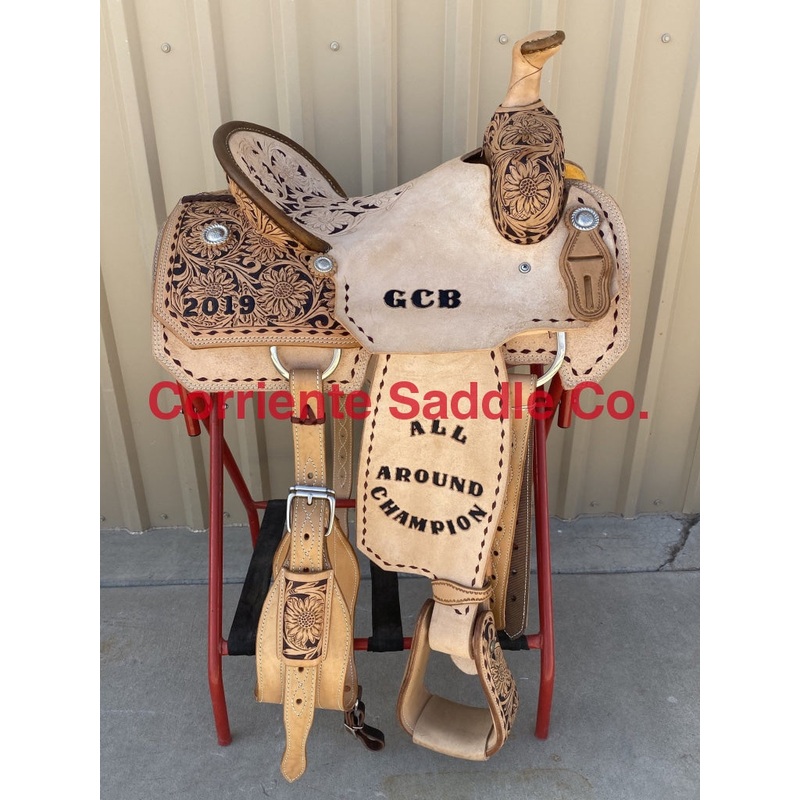This saddle is built on a wooden rawhide covered tree and comes with a latigo, back flank, stirrups, back billits and offstrap. To order give us a call or email us and we will get started on one for you. We take Visa, Mastercard and Discover. We offer seat sizes 14″ inch, 14.5″ inch, 15″ inch, 15.5″ inch, 16″ inch, 16.5 inch, 17″ inch, and 18″ inch in this saddle. On any saddle, we can add your brand, custom lettering, upgraded conchos, upgraded stirrups, etc. Trophy lettering is available for $50 as well on any saddle. Seat can be changed to a solid color suede seat of your choice.