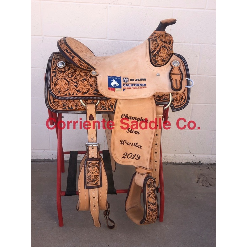 Low Cheyenne RollLeather TooledStirrupsLettering – $50FURTHER DETAILSThis saddle is built on a wooden rawhide covered tree and comes with a latigo, back flank, stirrups, back billits and offstrap. To order give us a call or email us and we will get started on one for you. We take Visa, Mastercard and Discover. We offer seat sizes 14″ inch, 14.5″ inch, 15″ inch, 15.5″ inch, 16″ inch, 16.5 inch, 17″ inch, and 18″ inch in this saddle. On any saddle, we can add your brand, custom lettering, upgraded conchos, upgraded stirrups, etc. Trophy lettering is available for $50 as well on any saddle.Trophy lettering can be painted the color of your choice.