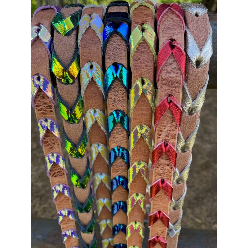 Custom laced reins, made in the USA.Quality leather, made to last.Holographic, metallic and iridescent options.7' 6" long, adjustable.