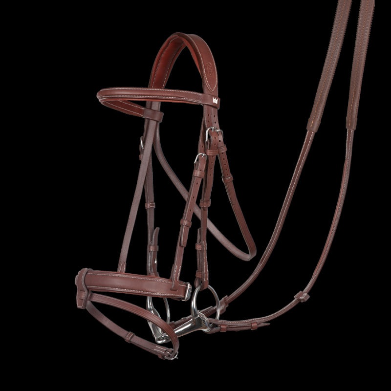 Discreet and efficient.McLain developed a refined and simple bridle. The leather used for the noseband and browband is curved, without overstitching, giving it a refined and minimalist style. The advantage: bit hook with an interior fasteningSold with his