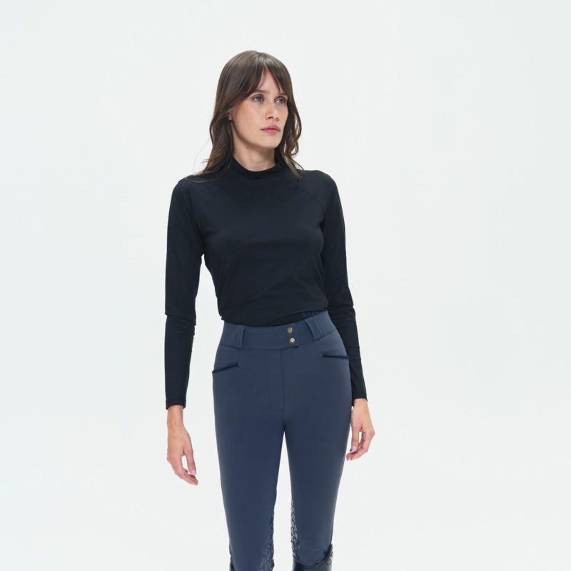Lightweight, long-sleeved technical riding T-shirt designed for riders seeking comfort and performance. Made from ultra-breathable, lightweight, and UV-protective Italian fabric, it offers a slim fit and a stand-up collar, ideal for riding. Available in coffee, black, and navy, this style combines elegance and practicality thanks to its easy care.