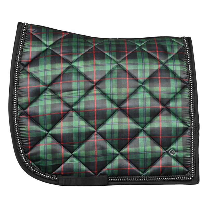 Introducing the highly anticipated Holiday Plaid Collection! This gorgeous pattern is the perfect, classic Christmas Plaid. What makes this collection extra special is that the pattern was chosen by our Barn Aisle Community! Not only are these pads beautiful to look at, but they are impeccably crafted by our manufacturing partner. No detail has gone overlooked, from the dirt-repelling top layer, the non-slip underside, luxurious crystal binding, and soft yet substantial padding. These pads are incredibly high quality and built to perform! The Full size is ideal for saddles 17″ and up, and the Cob size will work for saddles 17″ and under.