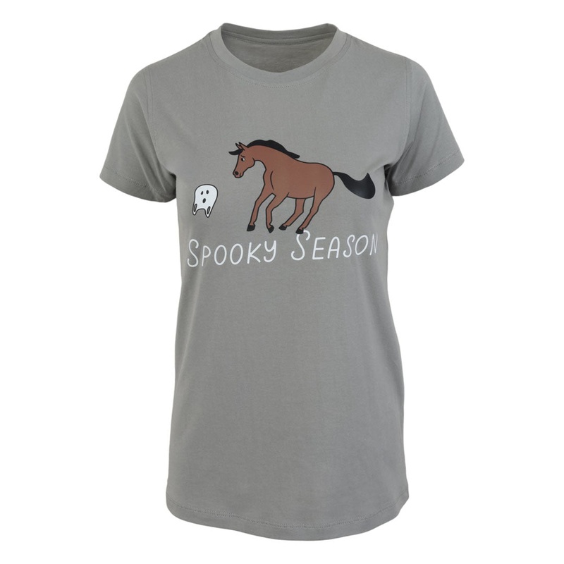 Get ready for spooky season laughs with our new Halloween Tee! This soft, grey, 100% cotton classic ladies' fit tee features a charming bay horse illustration hilariously spooking at the ultimate "ghost"a plastic bag. This original design and drawing by Da