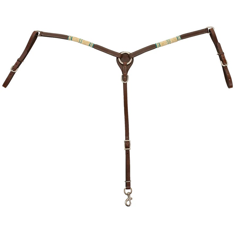 Introducing the Day Money Breast Collar! This beautiful piece is perfect for those who want a little something extra in their equine wardrobe. The chocolate finish is rich and luxurious, while the natural and turquoise braided rawhide add a touch of elegan