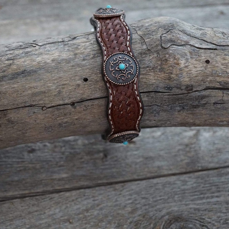Handmade leathermedium oil dog collar with basketweave tooling. Decorated with fourcopper floral turquoise conchos.