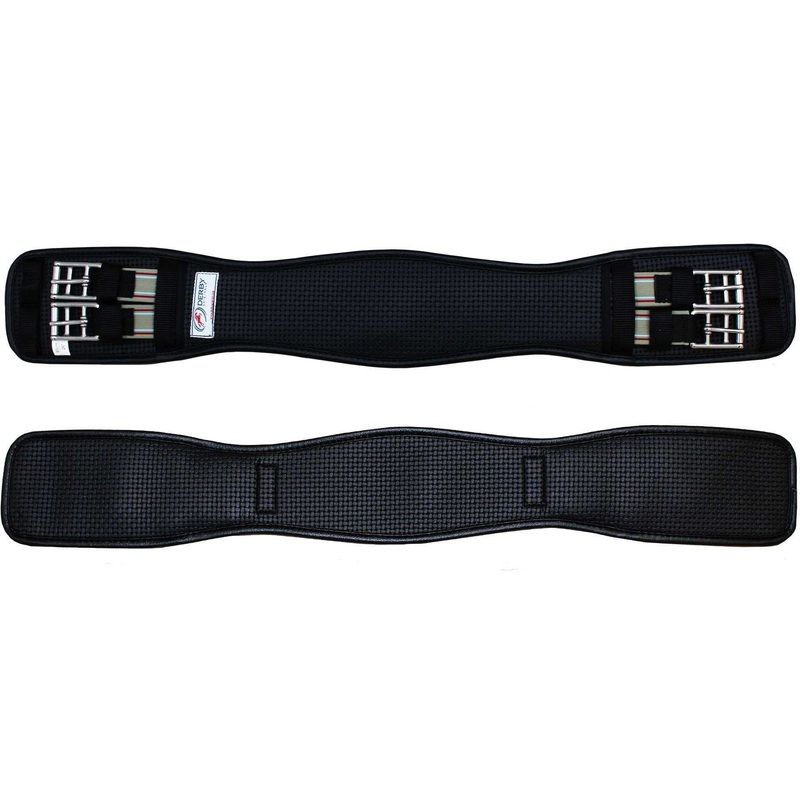 One of Derby Originals most advanced Dressage girths. Designed with your horses health and comfort in mind, this girth features Derby Originals Air Tech textured breathable material to ensure constant air flow during riding and prevent rubs and sores associated with traditional leather girths. The contoured shape of the girth and innovative sponge like material adapts to the shape of your horses girth area to not only keep it in place but to prevent painful pinching. Additional key features include durable elastic on both ends for a comfortable, snug girth fit and stainless steel roller buckles for easy adjustment. Can be cleaned easily with a damp towel, comes in a traditional black color suitable for dressage, and billet keepers for a smooth, seamless look. A must have for every equestrians tack collection.