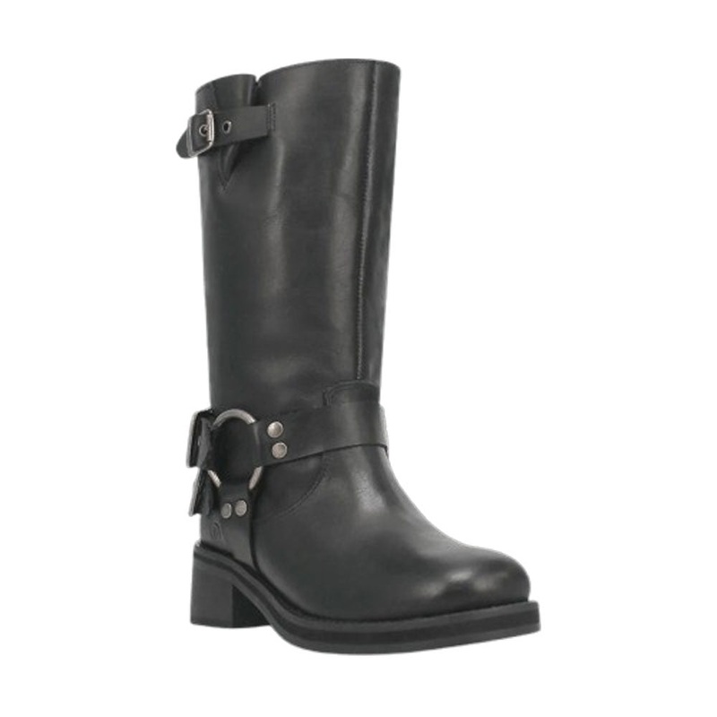 Dingo Women's Harlee Leather Round Toe Moto-Chic Boot in BlackLeather upperRound toePull-on style12" shaft height2" block heelHarness accent with buckle detailingCushion comfort insoleRubber outsoleColor: Black