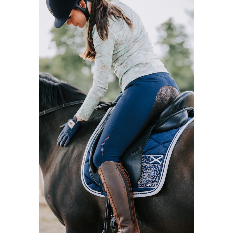 Prachtige rijbroek met bruin siliconen bloemmotief. Een perfecte rijbroek voor diegene die niet van zoveel bling en poespas houdt.