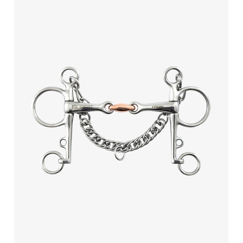 The double jointed Pelham with copper lozenge has a milder action in the mouth than some other Pelham’s as it distributes the pressure evenly across the tongue and bars of the mouth whilst reducing the nutcracker action of a single jointed bit. Copper warms and encourages the horse to salivate and accept the bit. Double jointed mouthpieces can affect the way the curb comes in to action and lessen the directness by putting more pressure on the bars of the mouth.