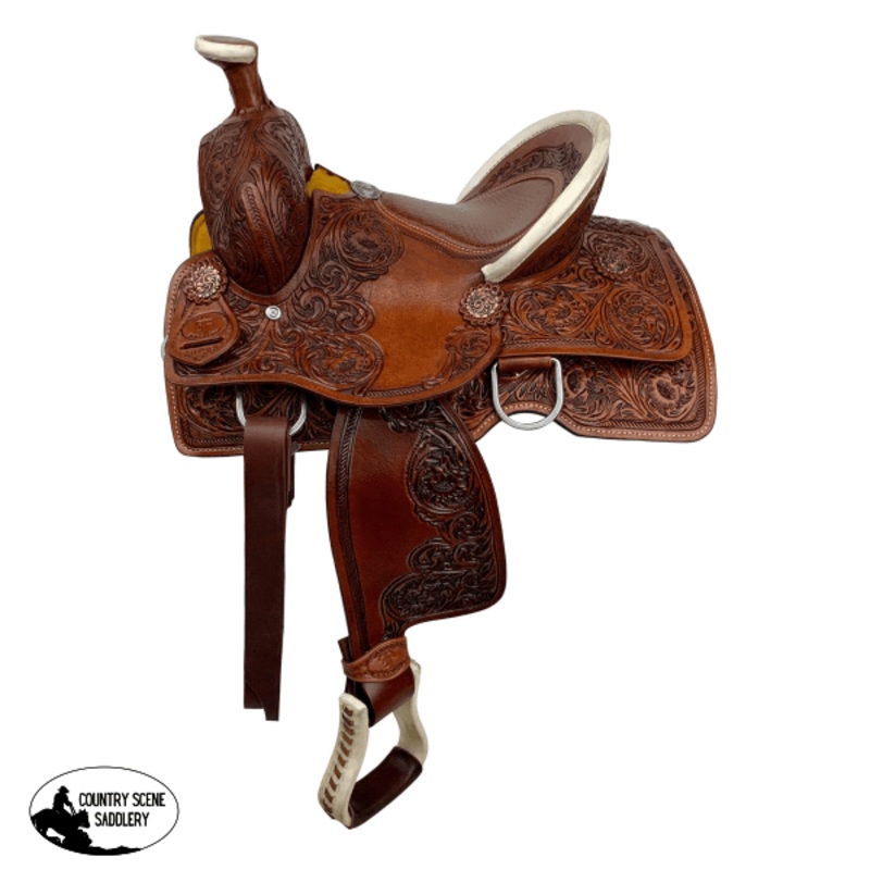 Medium oiled.Floral lilies tooling with rope tooled borders.Brown gator print cushioned seat inlay.Rawhide wrapped horn edge.Rawhide pencil roll seat.Copper floral conchos.Matching stirrup hobbles.Fully wrapped rawhide stirrups.Dee rigging.Comes with leath