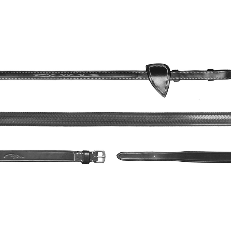 These reins are finished with attractive leather teardrop-shaped martingale stops.