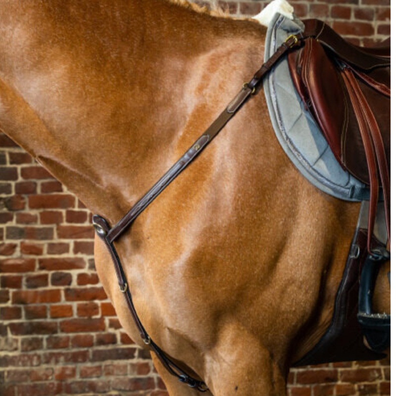 Horse BreastplateFeatures: Two additional dee rings for attaching draw or side reins 6 cm long elastic bands for comfort Snap hooks for attaching to the saddleHorse Breastplate Description:ThisHorse Breastplate is expertly crafted from subtly square-raised