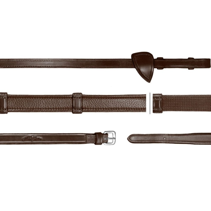 Flat English leather frontsLeather martingale stoppersMatching colour stitchingStainless steel bucklesHunter reins extra soft leather with rubber grip lining - 7 leather loops on grip part Width 5/8 (16 mm)Available in black or brown, pony, cob, and full.
