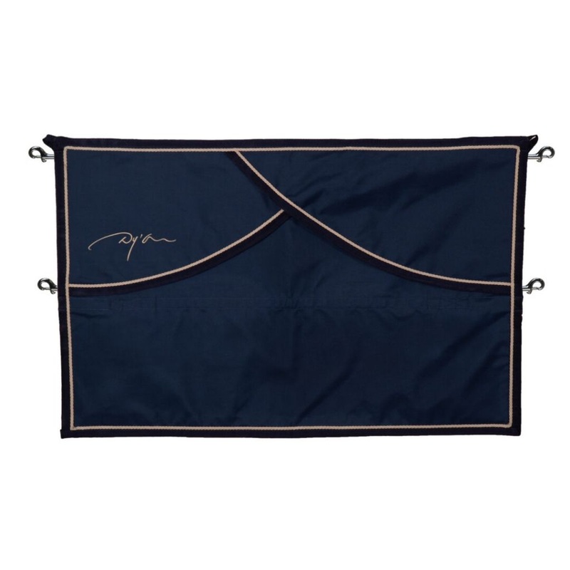Navy blue stall guard with blue binding and beige piping. Beige embroidered Dy'on logo.