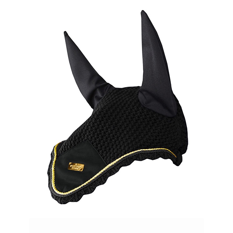 Luxurious ear bonnet in classic black with golden details. The net helps with both protection against insects and noise reduction. Crocheted ear net with elastic cloth by the ears for minimal friction. This ear net matches perfectly with the saddle pad fro