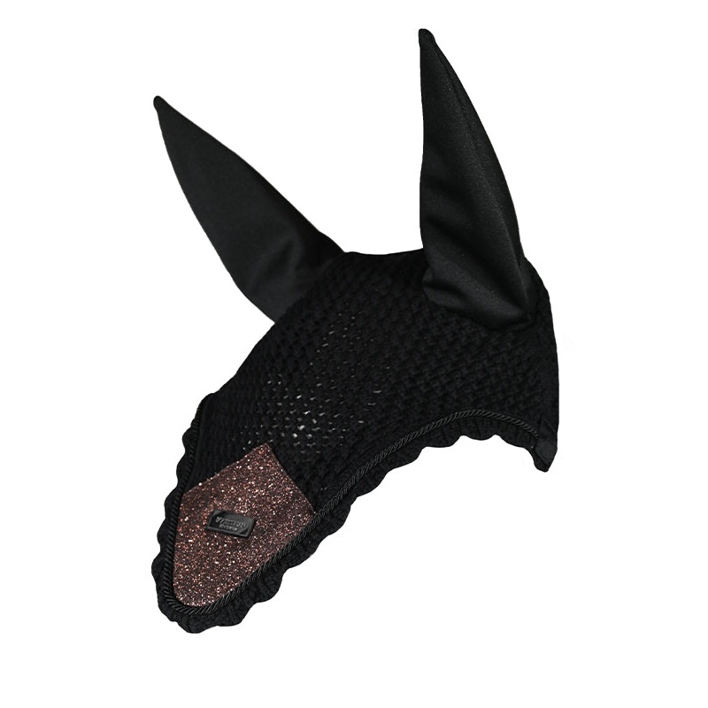 Crocheted ear bonnet in a stylish black. Decorated with a glittery brown patch on the front, beautiful piping and an Equestrian Stockholm badge in chrome. The bonnet provides both insect protection and noise reduction. It has elastic fabric on the ears for