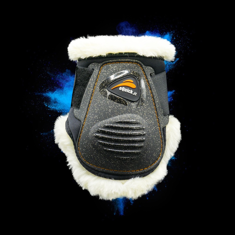 eQuick eLight Glitter Fluffy Fetlock Boots - sparkle in the sun with this practical hind boots from eQuick. The boots have a reinforced TPU shell and are equipped with a double Velcro to individually fit them to each horses leg. The 100% animal friendly, a