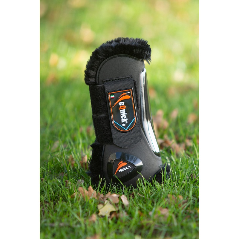 The black artificial sheepskin is extra soft and fluffy to ensure your horses comfort, whilst at the same time being easy care. Stylish eQuick details on the strap and bottom of the boots give them a great look.