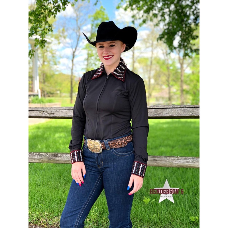 You’ll have no problem being seen as you ‘sparkle’ along the rail. This entry level Western show shirt has the look and feel of expensive brands and has a stretchy material for a close fitting, tailored look, giving riders a neat appearance. Crystals cover the collar and the cuffs to put on a brilliant, sparkling performance in every corner of the ring. by Royal Highness