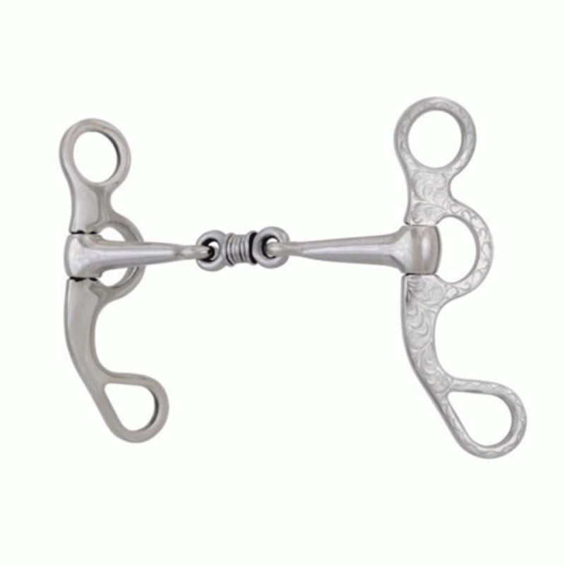 Showman Stainless Steel Engraved Shank Dogbone Bit. This stainless steel bit features a 6″ curved shank cheeks accented with engraved design. 3 piece broken 5″ mouth features a copper wrapped dogbone center.