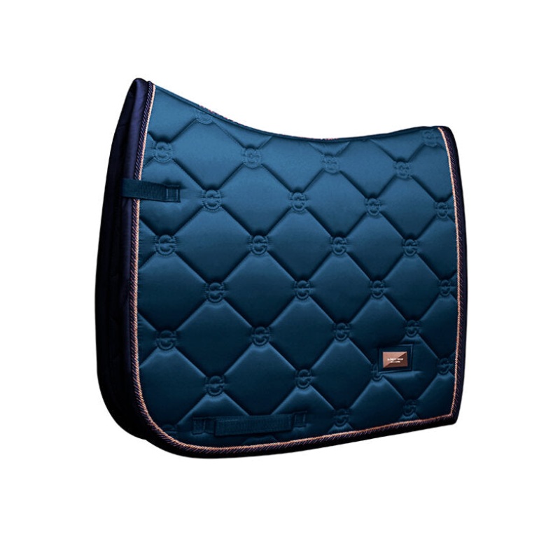 Exclusief zadeldek gemaakt in een prachtig marineblauw design met ros-gouden en marineblauwe biesjes. Versierd met een stijlvolle ros-gouden Equestrian Stockholm badge. Gemaakt van een glanzend, vuilafstotend materiaal dat goed ademt en je paard droog houd