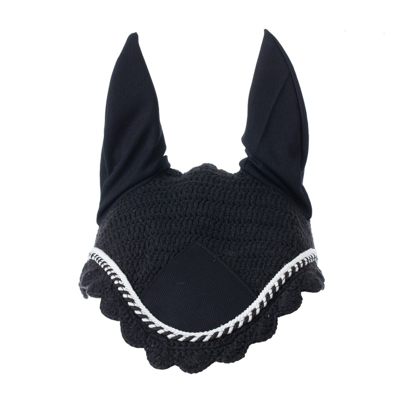 A stylish, hand-crocheted ear net for fly or noise protection.Features:Hand crocheted ear net with contrast pipingLightweight perforated fabric earsCenter patch that can be monogrammed if desiredUltraFleece: 100% poly. Body: cotton/poly blend. Trim: nylon