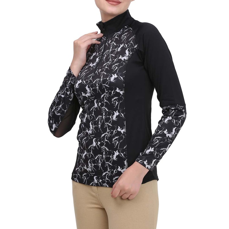 Nothing says sophistication and style quite like the Equine Couture Ladies Linear Horses Sport Shirt. Crafted with luxurious 100% Polyester fabric, the Sport Shirt offers superior moisture-wicking and UV protection, and added breathability with ventilated mesh underneath the arm. A matching zipper adds a touch of refinement, and a printed interior collar ensures a sleek and subtle look. Elevate your equestrian experience with Equine Couture.