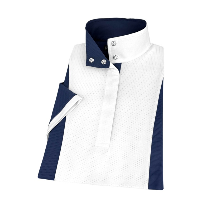 Step into the show ring with confidence and comfort in this high-performance show shirt. Featuring a crisp white cotton collar and cuffs, this shirt is crafted from a cool, 4-way stretch fabric designed to keep you comfortable. Strategically placed under-sleeve mesh panels provide excellent ventilation, while the tapered fit ensures it stays neatly tucked into your breeches.
