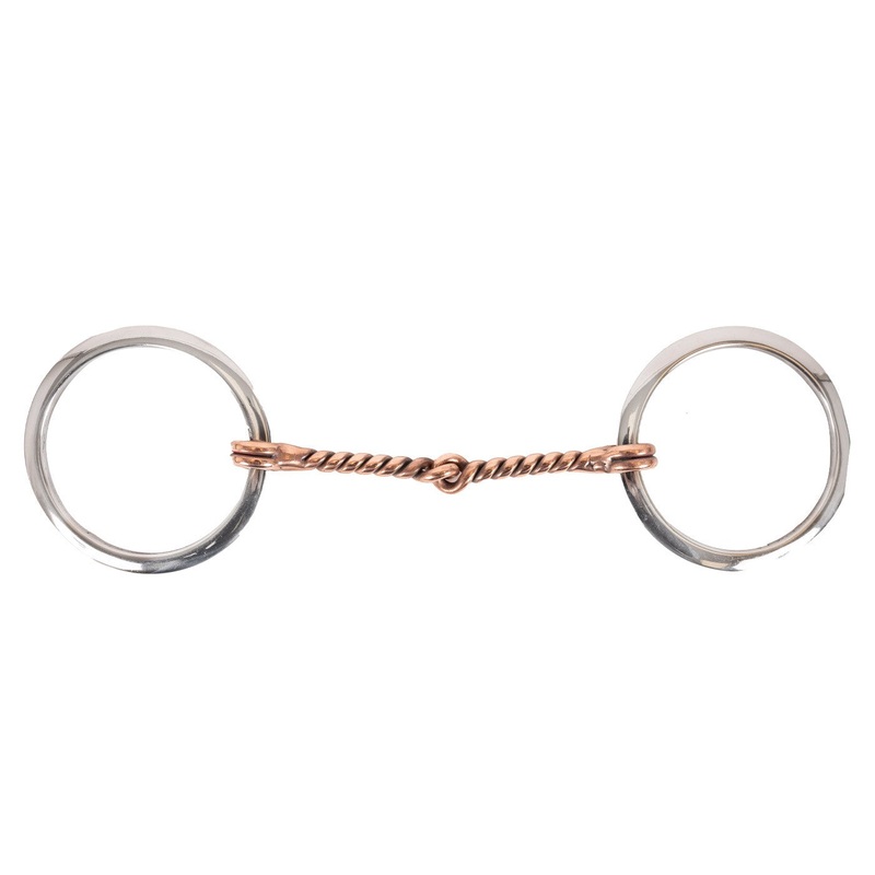 Flat, loose ring snaffle with copper wire twist. The loose ring gives mobility to the reins and copper encourages salivation. Flat loose ring snaffleCopper wire twist encourages salivationMouthpiece measures 10 mm thickRings measure 75 mm in diameter