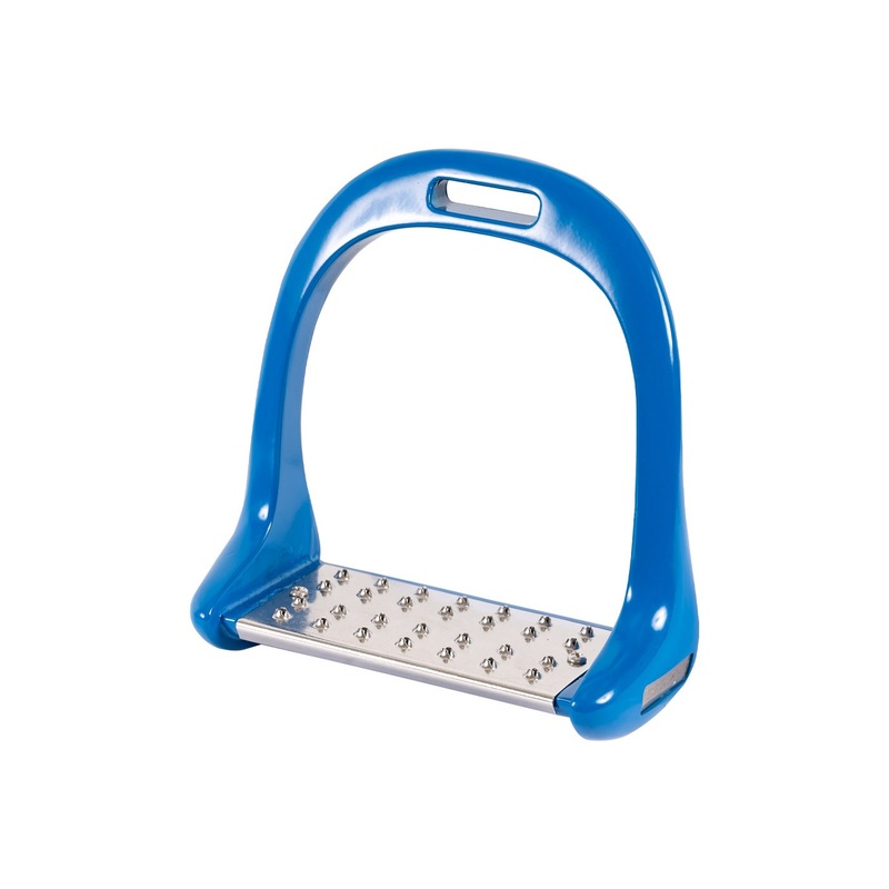 Lightweight aluminum stirrups designed for the utmost comfort and complete with a sporty yet polished look! A wider foot bed with a slight incline helps boost rider stability in the saddle, while the perforated cheese grater foot pad enhances grip. Ergonom