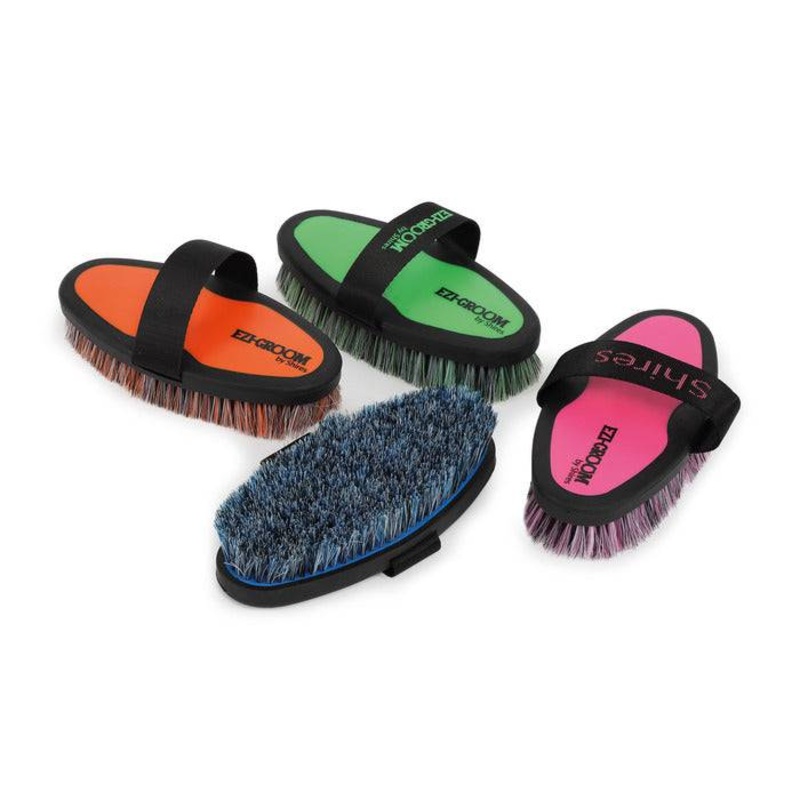 The EZI-GROOM large body brush has a soft hold grip back, web hand strap, soft bristles. For clipped horses or fine coats.