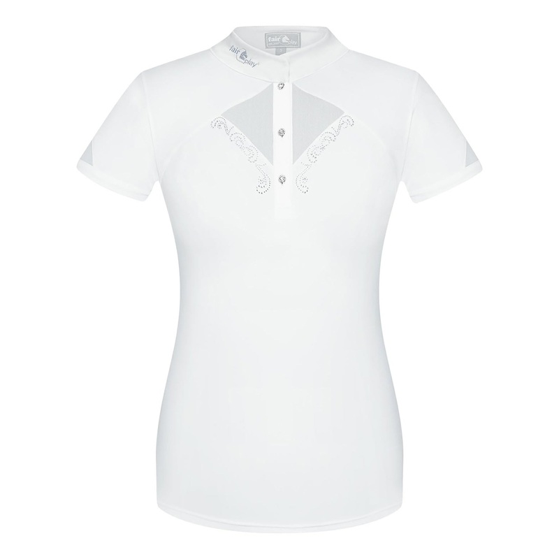 Very elegant and exceptionally feminineMade of an elastic and breathable fabricChic, white and silver, elastic insert on the sleevesEnhanced air circulation thanks to elastic mesh inserts on the front,back and sleevesDecorated with discreet crystal applica