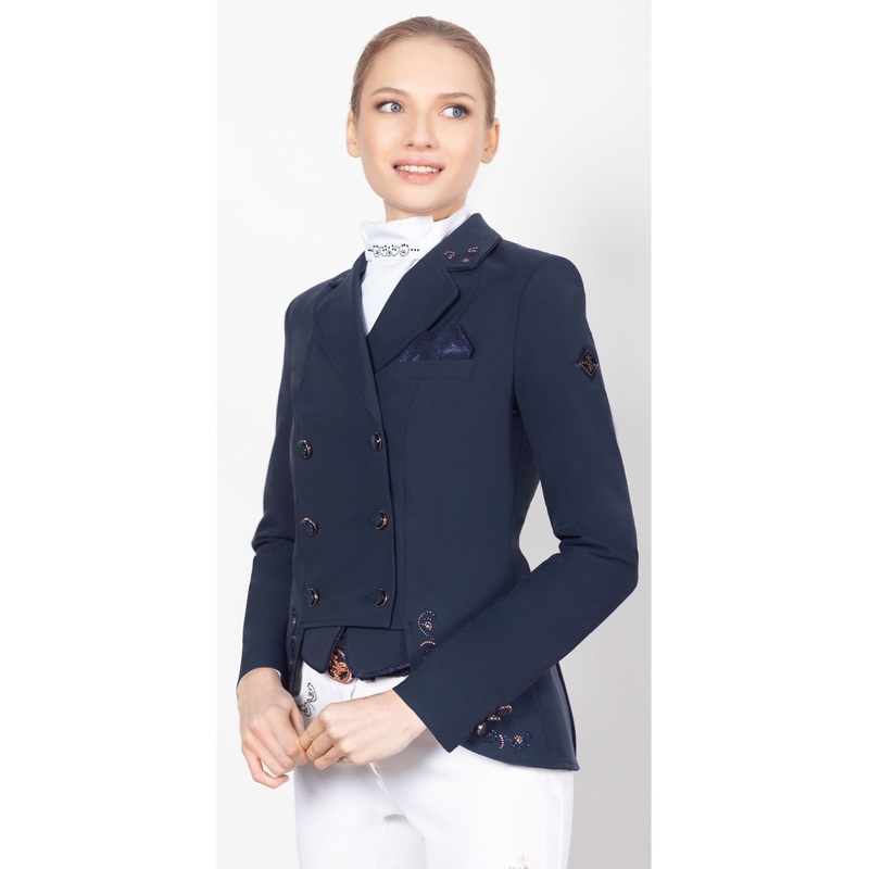 Elegant, double-row jacket underlining the feminine silhouette Highly breathable and elastic COMFINAT-tech fabric Decorative embroidery with rose gold jets on the front and back Tail lined with synthetic leather Comes with a ton to tone, satin pocket squar