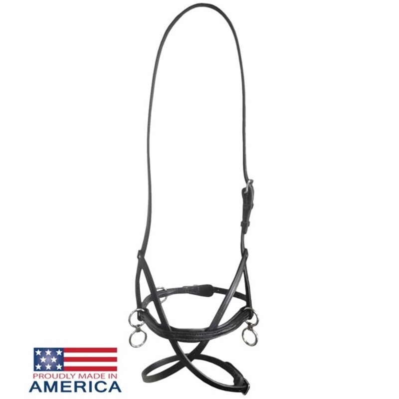This combines a race halter and figure 8 together. Includes rings for a head pole and tie down. Made of USA grade bridle leather with padded nose band.MADE IN AMERICA.Color:Black