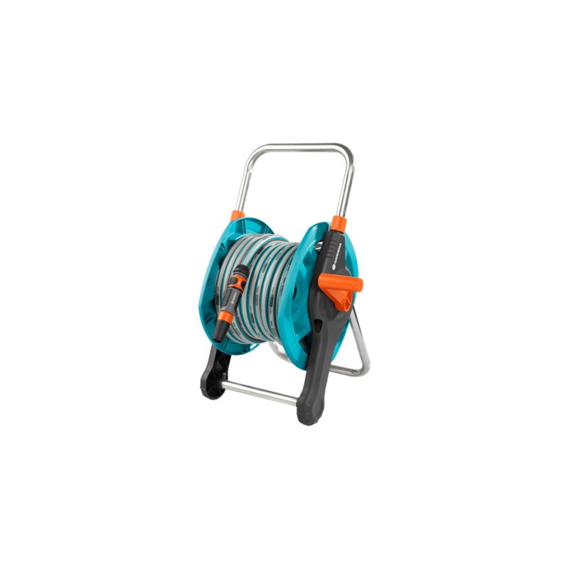 Telescopic handle and special folding mechanism provide for space-saving storage. Swivel axle prevents the connecting hose from turning when winding the main hose on or off.