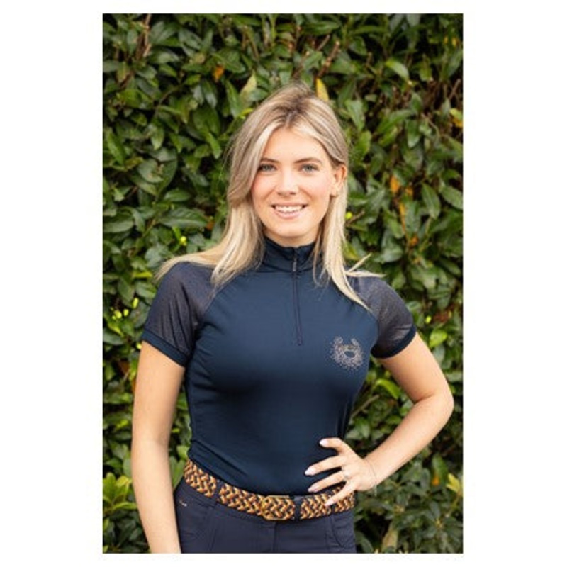 Short-sleeve shirt with a stand-up collar and a short zipper, sleeves with a lovely gold-coloured print, and an Equestrian Society logo with crystal details on the chest.Composition: 93% polyester / 7% elastane.COLOR: BlueberrySIZE: Ladies