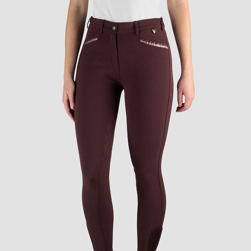 Great ladies breeches from comfortable micropolyester. The Alexa is well designed with a flattering fit and medium high waistband. Subtle glitter tape and crystal stone details make for a sophisticated look.The breeches feature two zippered front pockets,