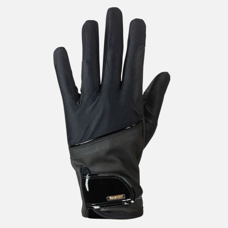 These riding gloves are made in a combination of lycra fabric and soft PU material. Mesh fabric between the fingers offers perfect ventilation to keep your hands cool while riding. The touch screen function is super practical if you want to use your phone. Details in shiny PU leather give a unique touch. A rubberized inside allows a good grip on the reins. The small logo badge is discreet and pretty.