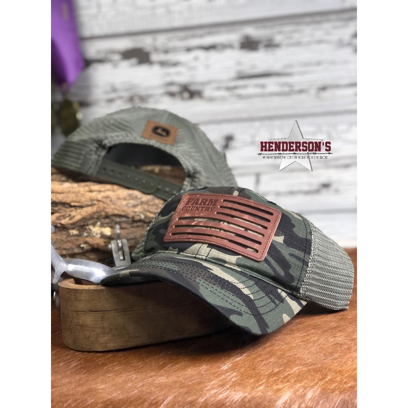 Mid profile. Curved bill with contrast stitching. 5 Panel. Eyelet vents. Soft mesh back. Snapback. “Leather flag with farm country” patch on front & logo patch on back.