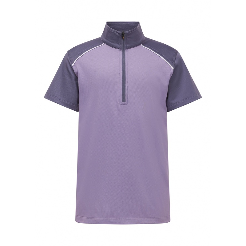 A cooling, short sleeve kids riding shirt with hi-tech, micro-mesh Coolcore fabric that wicks, breathes and covers. White piping adds a style pop on this cute, classic top, in tone-on-tone summer colors that coordinate with Kerrits kids tights and breeches. UPF+40 and a tall collar protect, while eight-inch zip neck boosts ventilation.