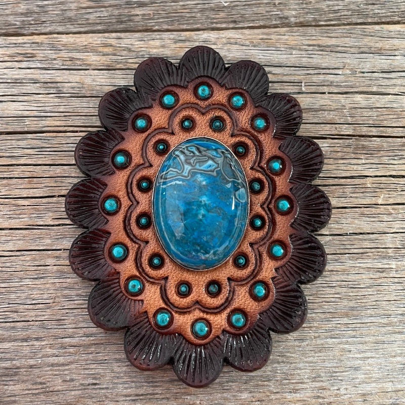 Leather rosette with dark oil edges andhand paintedturquoise dots. Along with copperwestern concho decorated with ablue cabochon stone. This measures at2.75” long and 2″ wide.